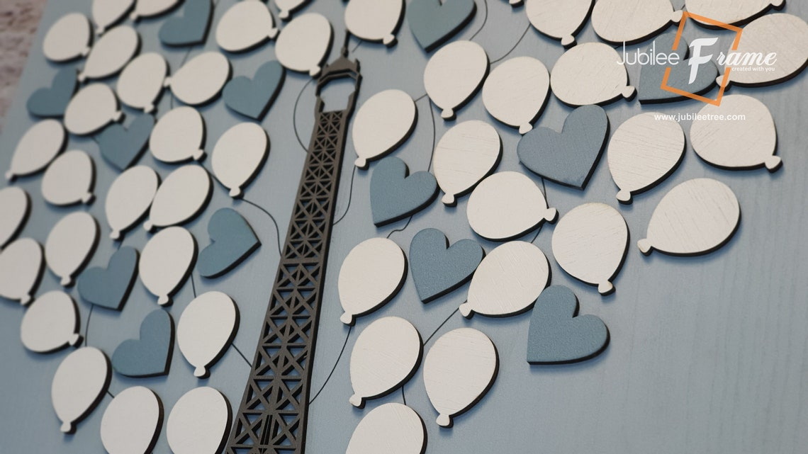 Pășiți într-o lume a romantismului și rafinamentului cu acest guestbook inedit, inspirat de farmecul atemporal al Parisului. În centrul designului se află o minuțios realizată miniatură a Turnului Eiffel, emanând eleganță și sofisticare. Deasupra sa, un ansamblu delicat de baloane plutitoare simbolizează speranțele, visurile și urările pline de bucurie ale invitaților voștri.