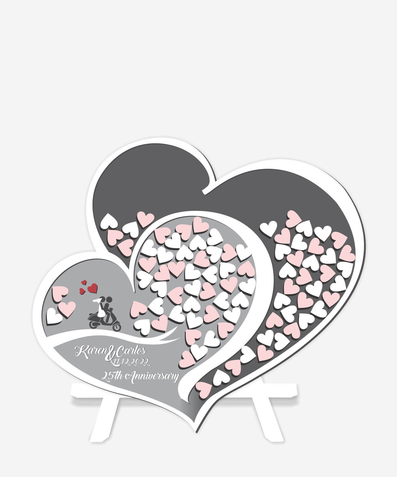 Pornește în călătoria vieții alături de Guestbook-ul nostru „Forever Guestbook”, un suvenir plin de emoție ce simbolizează iubirea, unitatea și noile începuturi. Cu un carte de oapeti specială, realizată dintr-o linie continuă ce formează două inimi interconectate, acest design surprinde într-un mod unic mirii călătorind împreună pe un scuter sau motocicletă – o metaforă a aventurii comune pe care o încep împreună.