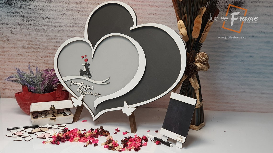 Jubilee Frame este un Guest Book personalizat, creat special pentru evenimentul dumneavoastră. Aveți libertatea de a alege culorile de fundal și elementele decorative (nume, data evenimentului, inimioare, baloane, stele, fluturi sau alte forme), astfel încât să se potrivească perfect tematicii evenimentului.