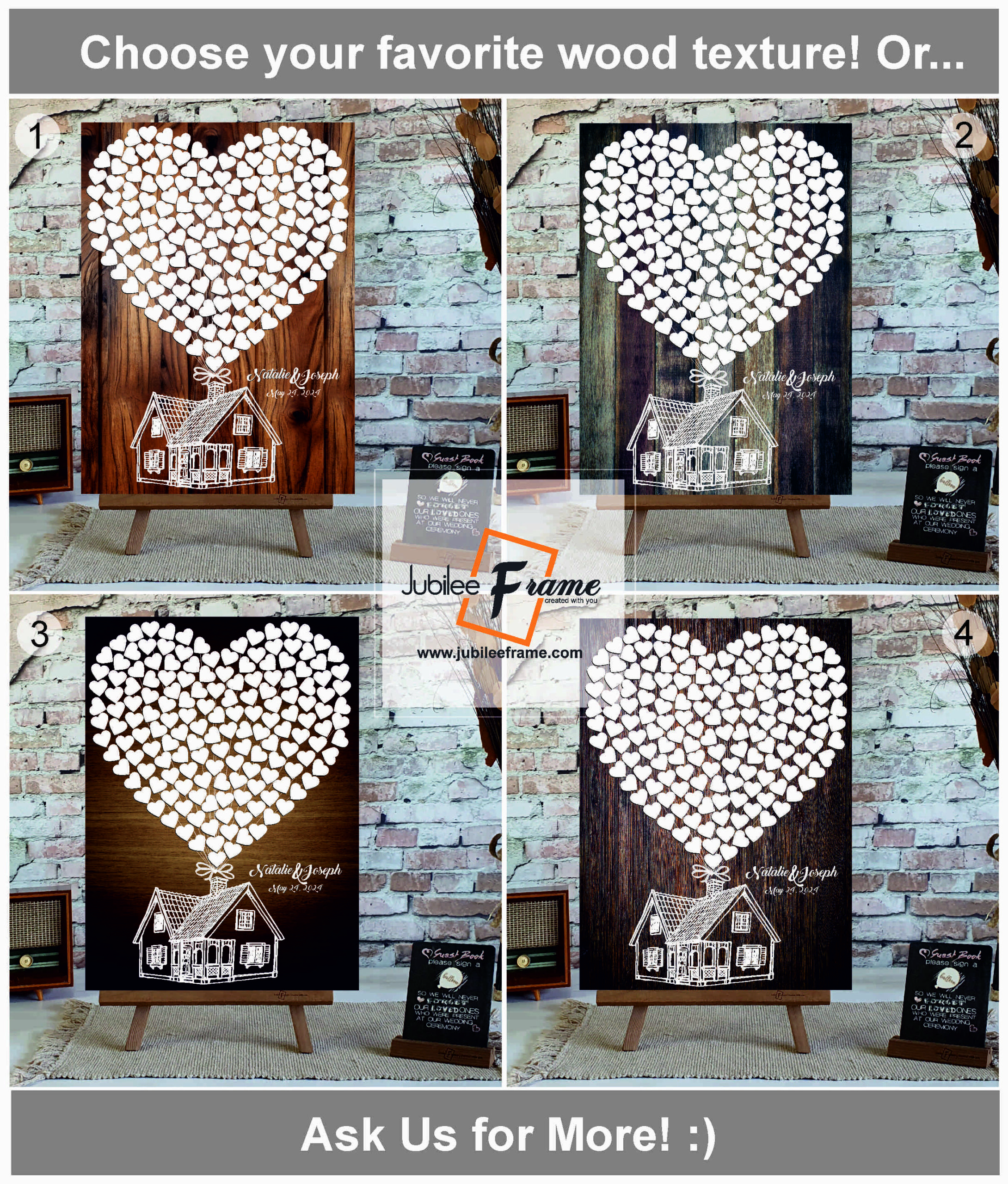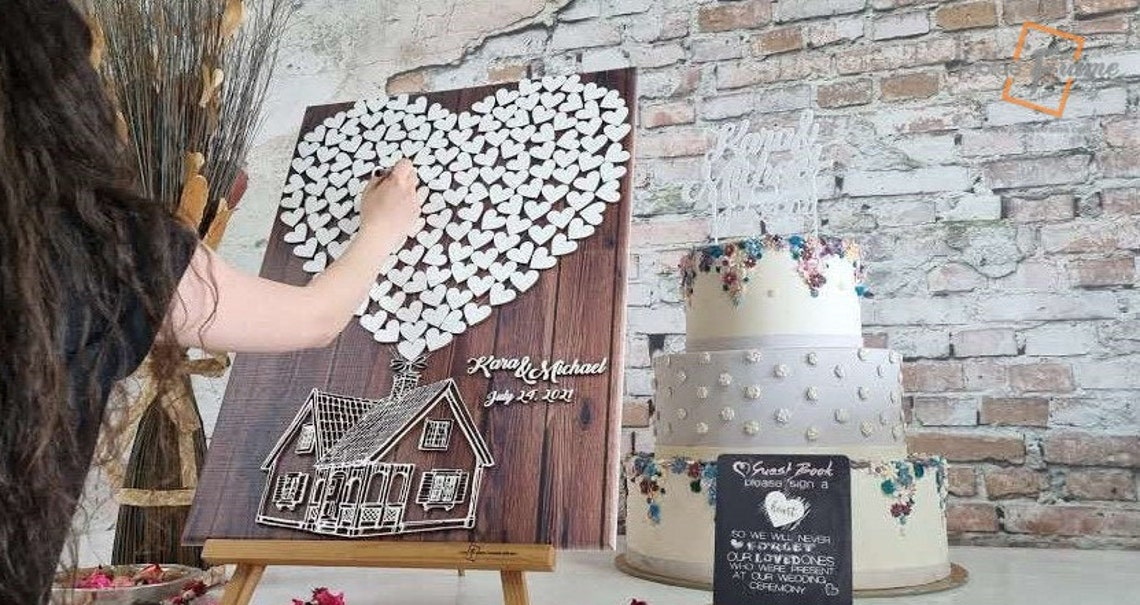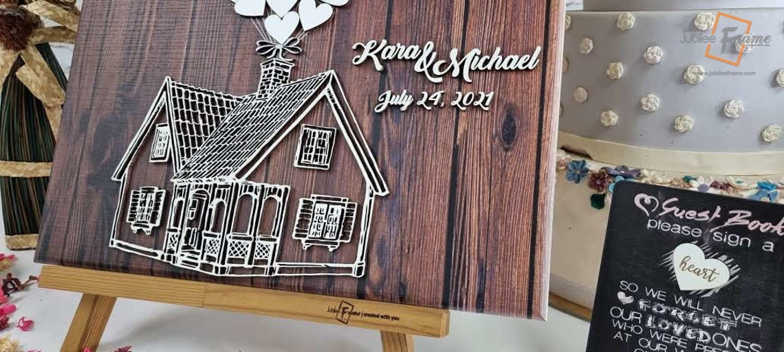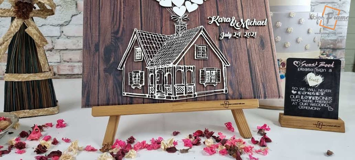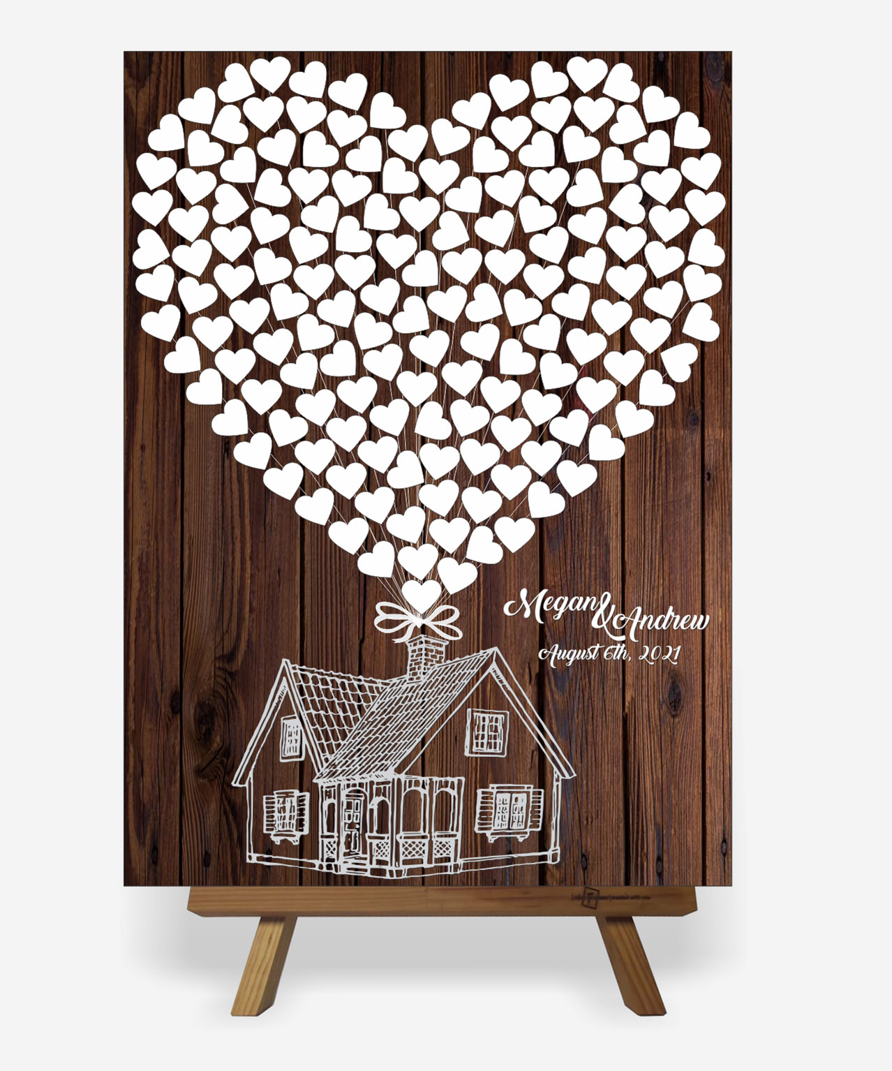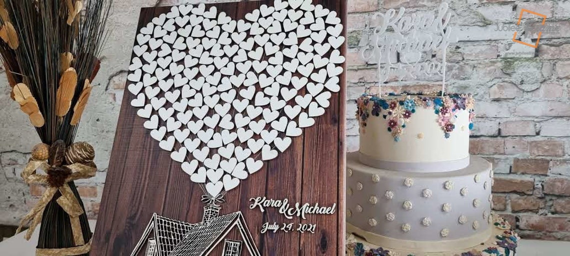 Schimbă-ți nunta într-o sărbătoare plină de fantezie cu varianta noastră originală pentru cartea de oaspeți de nuntă, inspirată de alura legendară a casei din filmul Up. Realizată din lemn și decorată cu baloane elegante sub formă de inimă, disponibile în nuanțe la alegere, este gândită să capteze afecțiunea și veselia momentului tău unic.