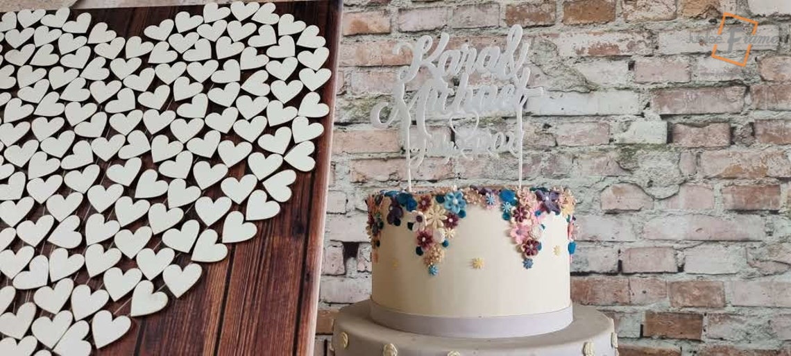 • Cake topper personalizat din acril alb – cu initialele mirilor